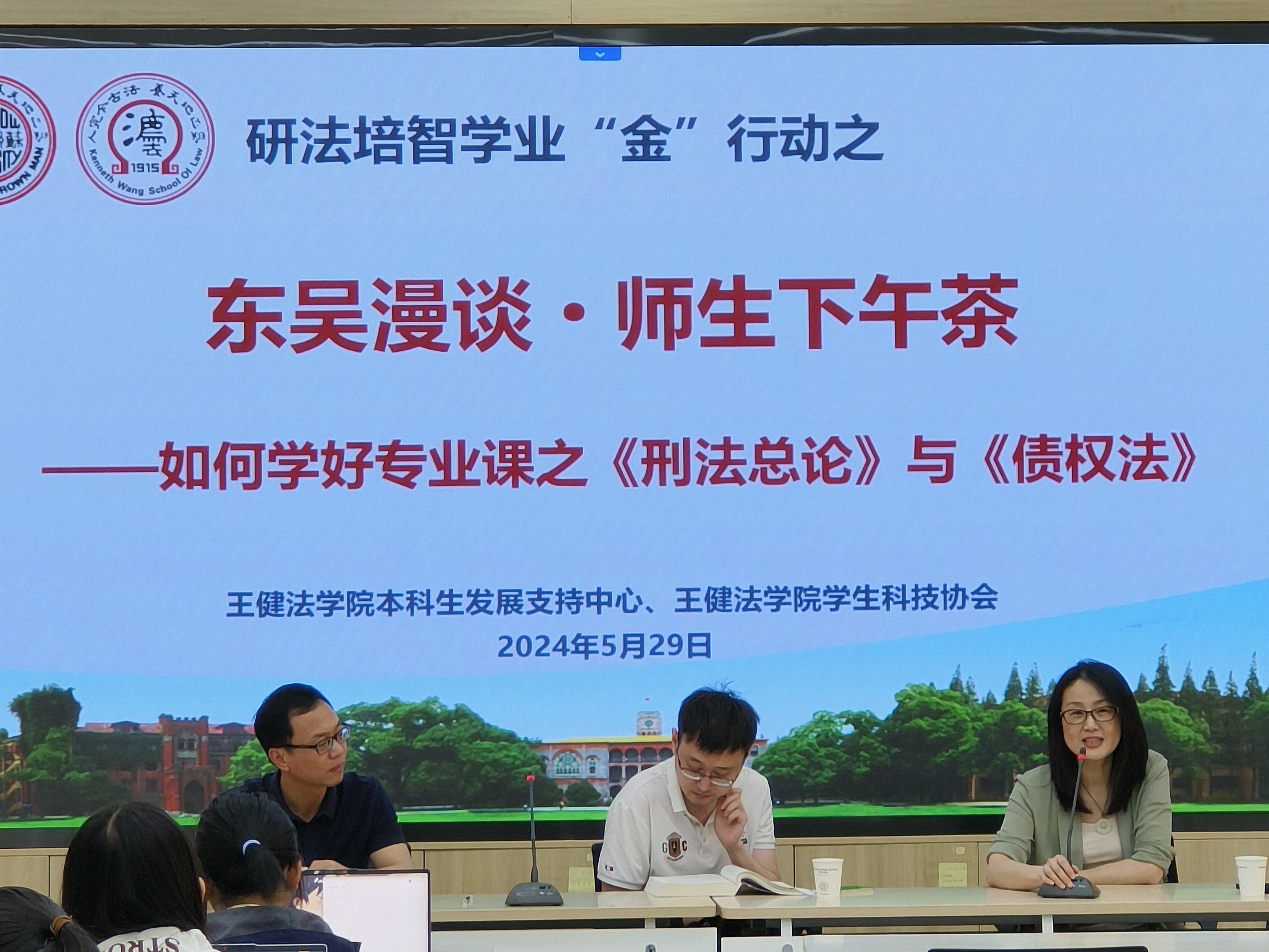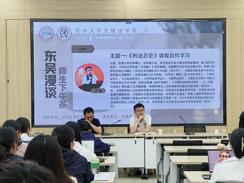 为贯彻教育部“以本为本、四个回归”精神,529日下午,禁漫天堂 “东吴漫谈·师生下午茶”活动在法学院B105举办。学院党委副书记副院长朱春霞老师以及王俊、黄文煌两位专业老师与2023级本科生齐聚一堂,旨在为大家提供一个轻松愉快的交流平台,共同探讨《刑法总论》和《债权法》两门课程的学习方法,相互启发,共同进步。