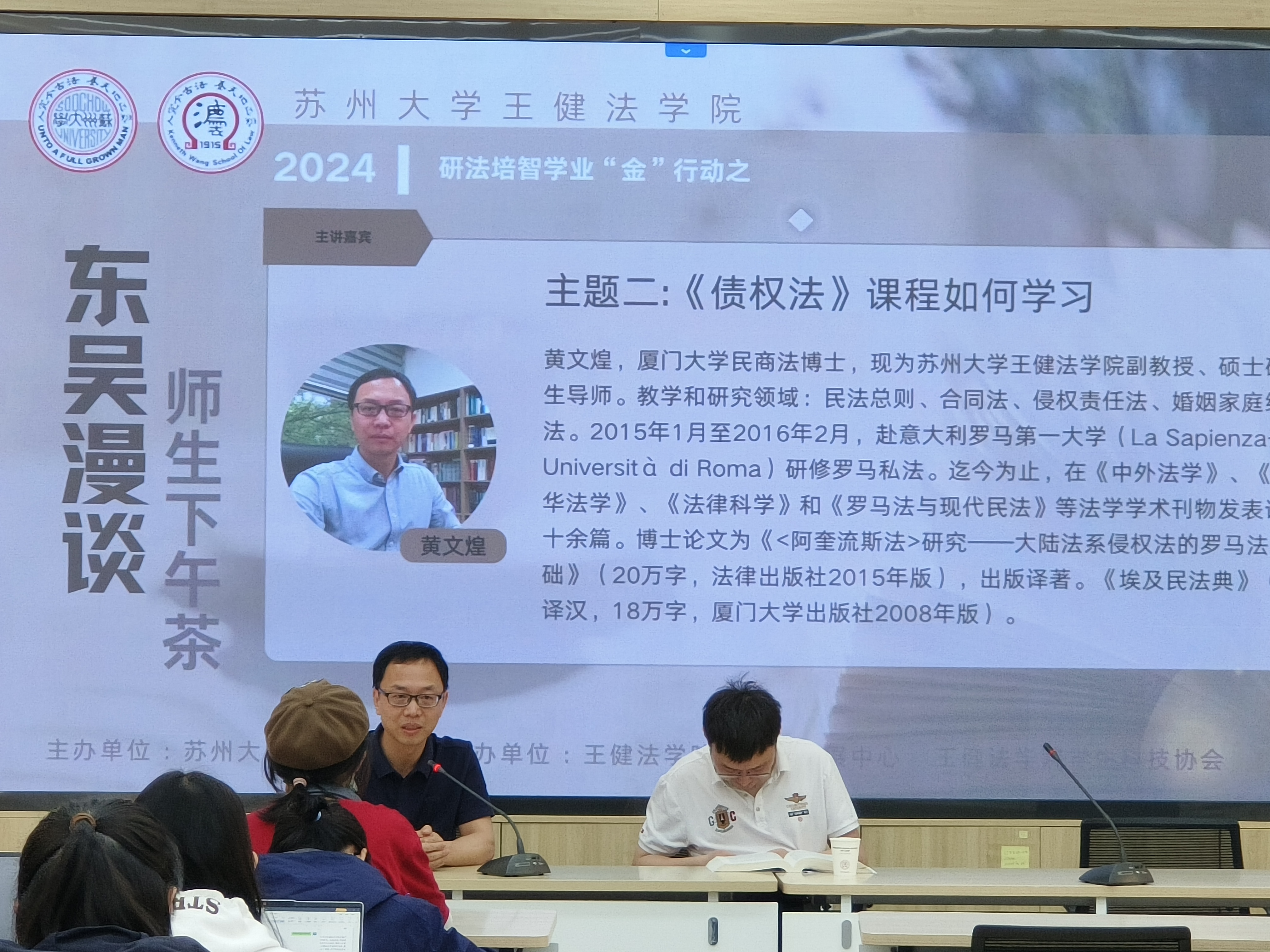 随后,黄文煌老师带来了有关《债权法》学习方法的指导。与王老师不同,黄老师并未着重讲述债权法课程学习的具体内容,而是重点想和大家分享一下自己的学生生涯和教学感受。作为学生投票产生的学院“最受欢迎的老师”之一,黄老师讲述了学生时代的爱好与心理感受以及自己的考研经历,引起了同学们的共鸣。不过,黄老师和王老师都强调了一点,那就是好读书、读好书。他提出同学们一定要有自己的追求,要带着热情学债法。两位老师都分享完毕后,在场的同学们积极踊跃举手发言。从专业的理论到法条的背诵,再到考试的技巧,问题花样百出,老师们的答疑也细致认真,大家纷纷表示颇有收获。
