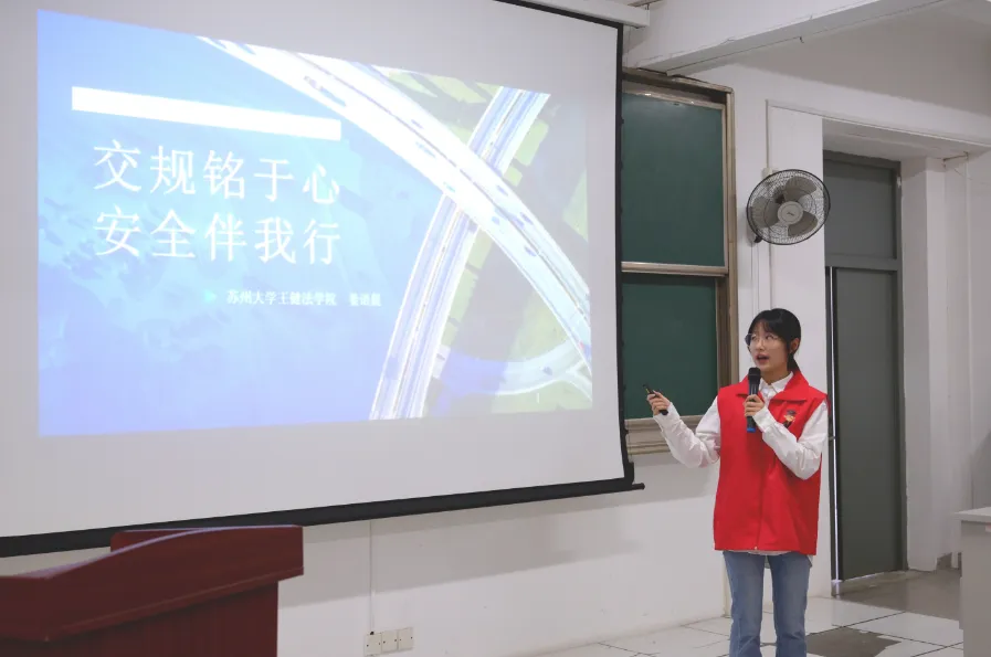 随后,禁漫天堂 “小法师”宣讲团成员2023级研究生姜语晨以《交规铭于心,安全伴我行》为题进行宣讲。随后交通管理局交通事故对策大队副大队长王超就《苏州市道路交通安全教育电动自行车专题》做汇报,新区大队横塘中队张开仁讲解骑行安全。