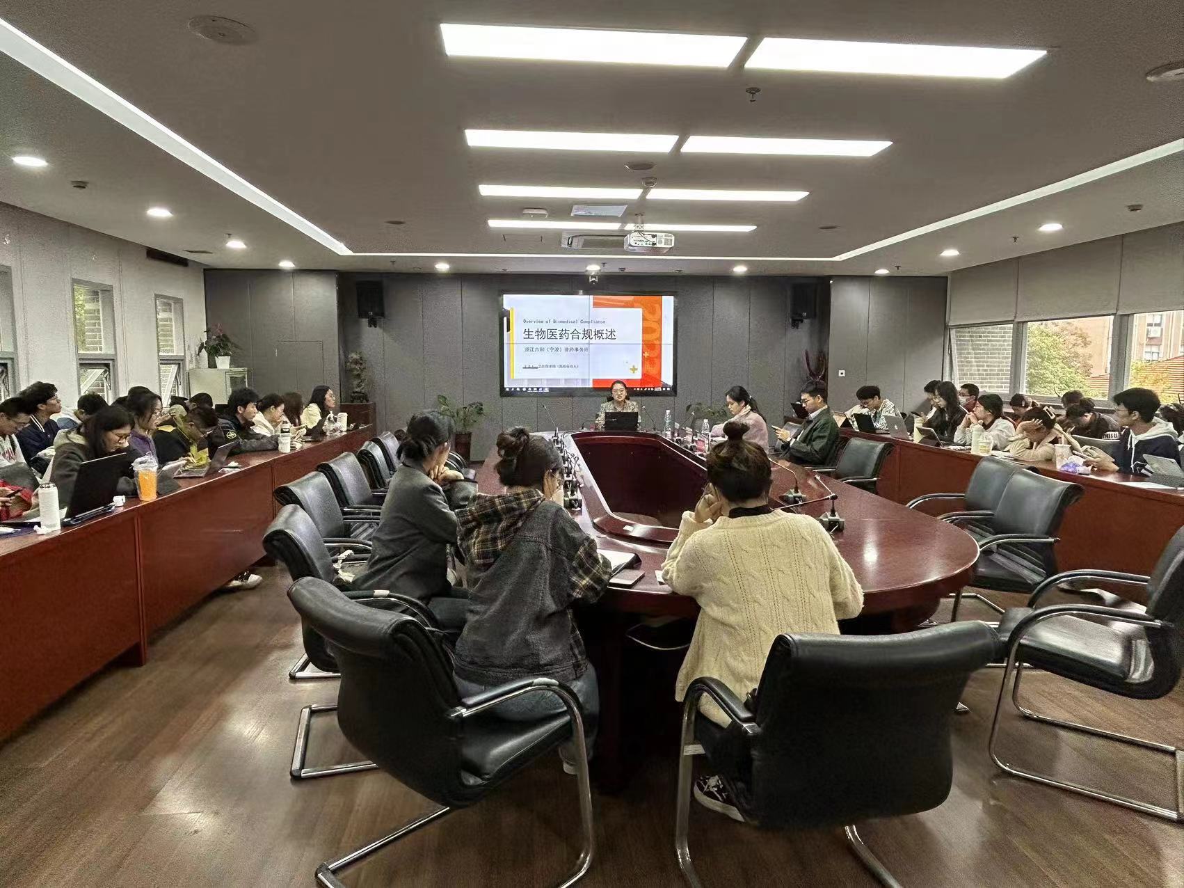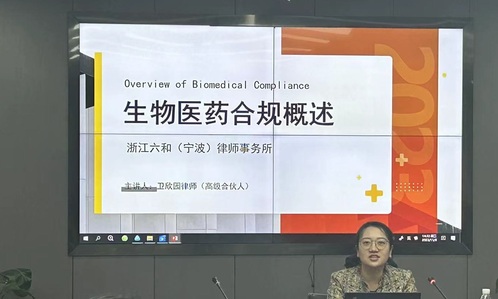 同时,还邀请到负责生物医药行业的卫欣园律师开展《生物医药合规概述》讲座。卫欣园律师是浙江六和(宁波)律师事务所高级合伙人。基于近年来中国药企开启全新的时代,需要合规经营、转型升级的背景,卫律师从四个方面向同学们进行介绍,分别是生物医药合规的简述(背景、定义、重要性)、生物医药合规的十大关键要素、生物制药的法律框架以及国际药企合规体系建设关键要素。其中,卫律师重点讲述了RDPAC行业合规准则,阐述其范围和定义、医学互动交流活动的基本原则等,让同学们受益匪浅。最后,卫律师还结合自身情况向同学们介绍了律所的研究方向及对人才的需求现状,鼓励同学们明确自身发展方向。讲座深入浅出,氛围活跃。