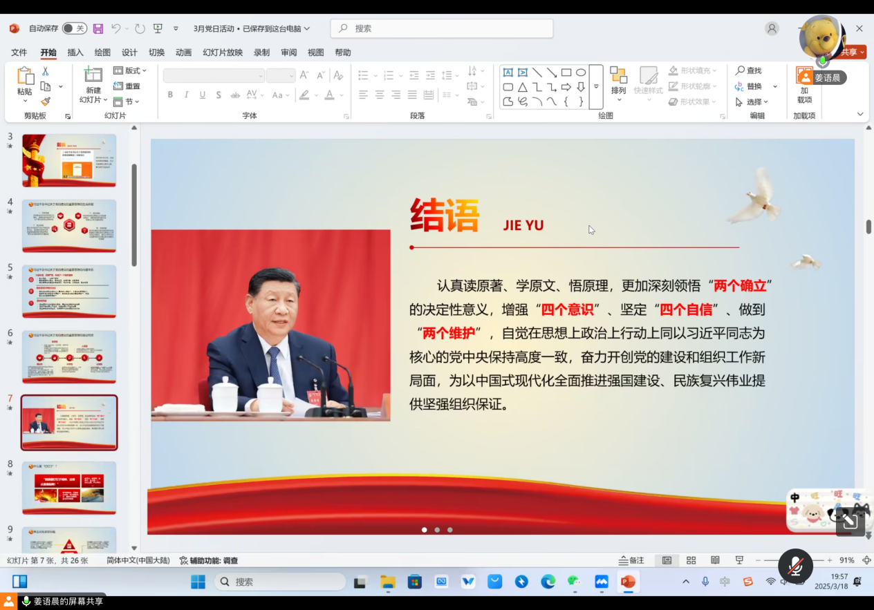 立足实践,展望未来 活动尾声,支部书记总结指出,习近平总书记关于党的建设的重要思想为支部建设提供了行动指南。未来,支部将持续深化理论学习,创新活动形式,引导党员将学习成果转化为推动工作的实际成效,为以中国式现代化全面推进强国建设、民族复兴伟业贡献青春力量。