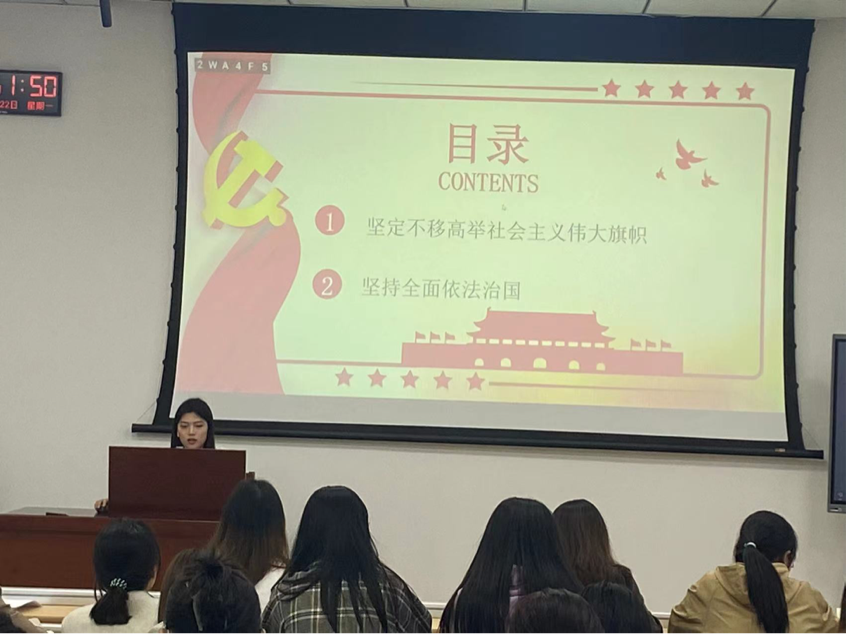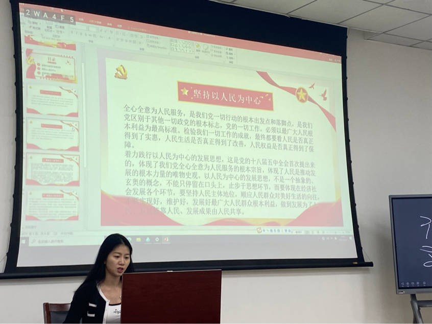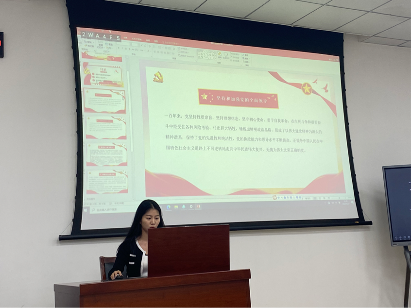 陈冰洁同学从坚持和加强党的领导、坚持以人民为中心、实施科教兴国三个方面入手,对学习成果进行了分享。一百年来,党坚持性质宗旨,坚持理想信念,坚守初心使命,勇于自我革命,在生死斗争和艰苦奋斗中经受住各种风险考验、付出巨大牺牲,锤炼出鲜明政治品格,形成了以伟大建党精神为源头的精神谱系,保持了党的先进性和纯洁性,党的执政能力和领导水平不断提高,正领导中国人民在中国特色社会主义道路上不可逆转地走向中华民族伟大复兴,无愧为伟大光荣正确的党。
