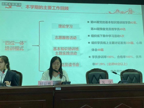 首先,付晨熙老师对本学期的党校培训工作进行简单回顾。本期党校培训将理论学习、志愿活动、主题实践和读书会相结合,坚持“四位一体”的培训模式,本期培训班参训率100%,结业率100%。此外,付晨熙老师还回顾了分党校特色主题活动如“谢谢你的smile”摄影大赛、大学生就业体验周等,对活动主题、活动效果、活动立意等方面进行总结展望,提出了更高要求的建议。