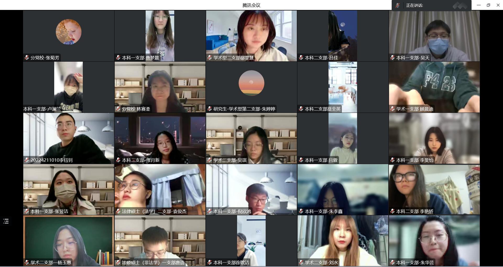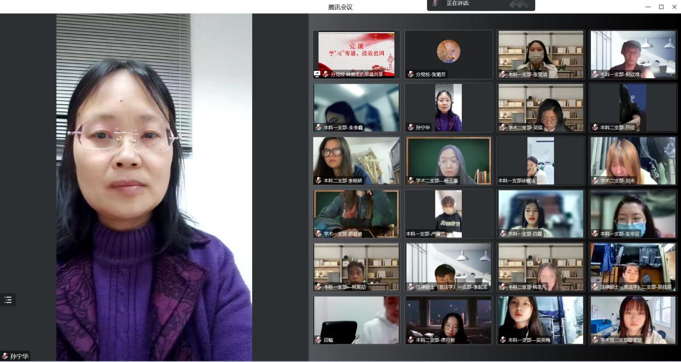 最后,本期学员代表预备党员鄢雯慧同学发言。鄢同学提到,在疫情爆发的这段时间里,正是在老师们与同学们的共同努力下,法学院才能实现这样优异的防疫成果。经历了疫情,她更切切实实体会到了中国共产党“为人民服务”这一宗旨的深刻内涵。党员应该以更高的标准要求自己,要在思想政治、专业学习、校园活动等方面发挥凝聚带头、示范激励作用,从小做起、从我做起。