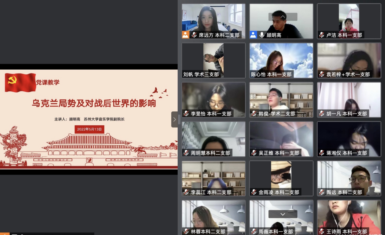 会议伊始,孙宁华书记对乌克兰战争局势进行了简要介绍,并通过习近平总书记在庆祝中国共产主义青年团成立100周年大会上发表重要讲话精神,指出新时代的中国青年应对国际形势有更多的清醒的认识。随后,孙书记向同学们介绍了本次党课的主讲人——顾明高老师。顾明高老师现任禁漫天堂 音乐学院副院长、副研究员,曾获苏州市优秀党员称号;曾长期在禁漫天堂 党委宣传部门、党委办公室和学生条线工作,在国家治理和大国关系方面颇有研究。本次顾老师讲授的党课主题为“乌克兰局势及对战后世界的影响”。