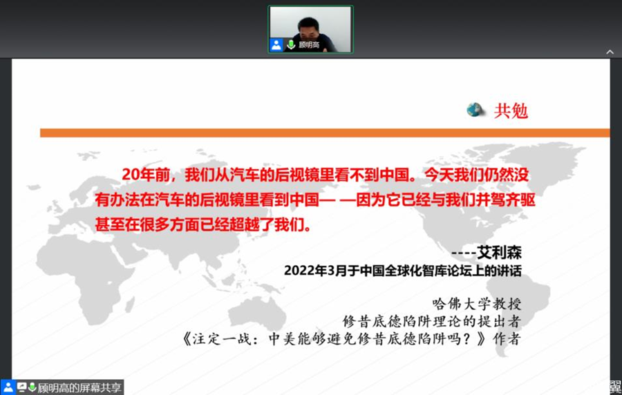 会议最后,付晨熙老师总结本期党课思路清楚、观点鲜明、论据充分,当中有很多非常独到的观点,对我们观察当下的国际形势和中国的发展环境很有帮助。顾老师授课时在不经意中穿插了大量的中国传统文化、中国历史和党建党史、党的政策等很多丰富的内容,这也是一次非常生动的爱国主义和党史学习教育。希望同学们通过本次党课和未来学习,用敏锐的眼光观察社会,用清醒的头脑思考人生,用智慧的力量创造未来。