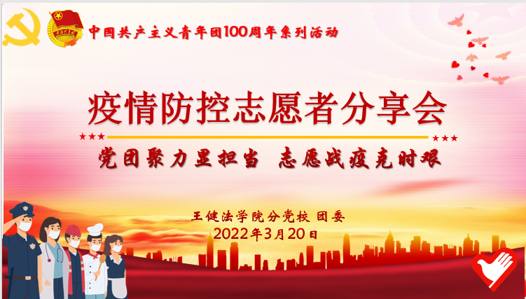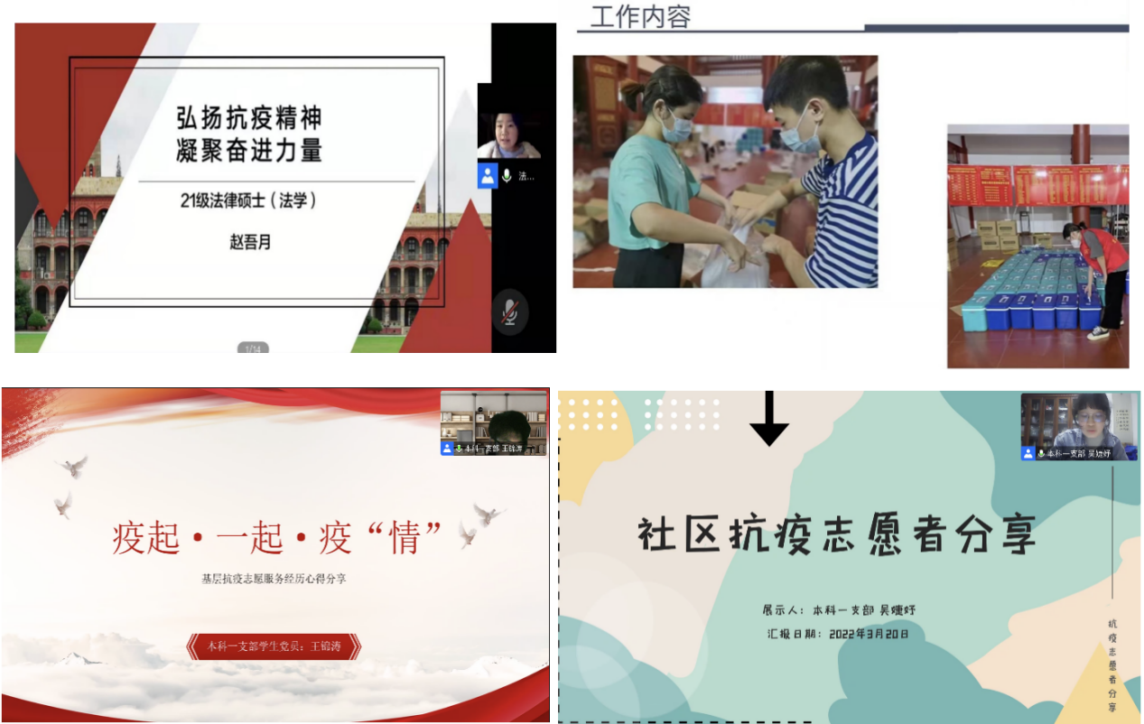 接着,法律硕士(法学)一支部、21级法律硕士(法学)班级的党支部书记赵吾月同学以《弘扬抗疫精神,凝聚奋斗力量》为题,分享了她的抗疫经历,让我们看到了青年党员挺身而出,甘于奉献的青春姿态。法律硕士(非法学)二支部、21级法律硕士(非法学)班级的团支部书记蔡进萍同学由于家乡突发疫情,积极参到核酸物资的配送工作中,无法线上与我们互动交流。她提前录制好视频,以这样特殊的方式与大家分享她的抗疫故事,这也让我们看到青年党员听从指挥、争做表率的责任与担当。本科一支部、19级知识产权班的院团委委员王锦涛同学,以《疫起·一起·疫“情”》为题,分享了他为期一个多月的志愿服务经历,尽己所能参与抗疫服务工作,充分发挥了党员模范的示范作用。本科一支部、18级法学一班、曾任学院团委副书记的吴婕妤同学为我们分享了她在社区参加的抗疫志愿服务经历,让我们看到禁漫天堂 青年积极投身一线,在疫情防控中勇担使命的实际行动。