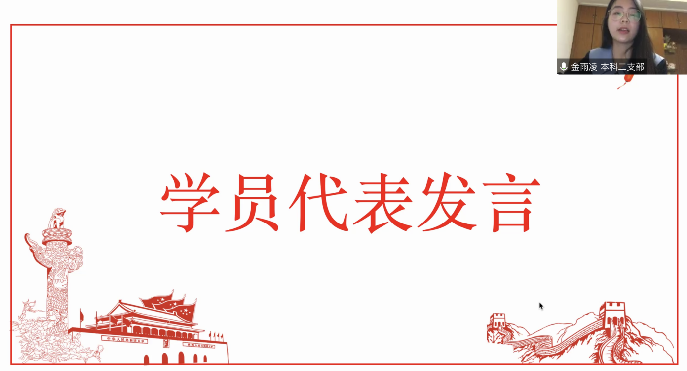 接着,本期学员代表预备党员金雨凌同志发言。金雨凌同志认为共产党员在疫情时代要勇挑重担,发挥先锋模范作用,守护国家与人民的贡献,强调成为党员是人生道路的新起点,也是党员政治生命的起点。金雨凌代表所有学员郑重承诺:珍惜学习机会,端正入党动机和学习态度,在培训过程中增强理论学习、锤炼党性修养、做到学以致用。