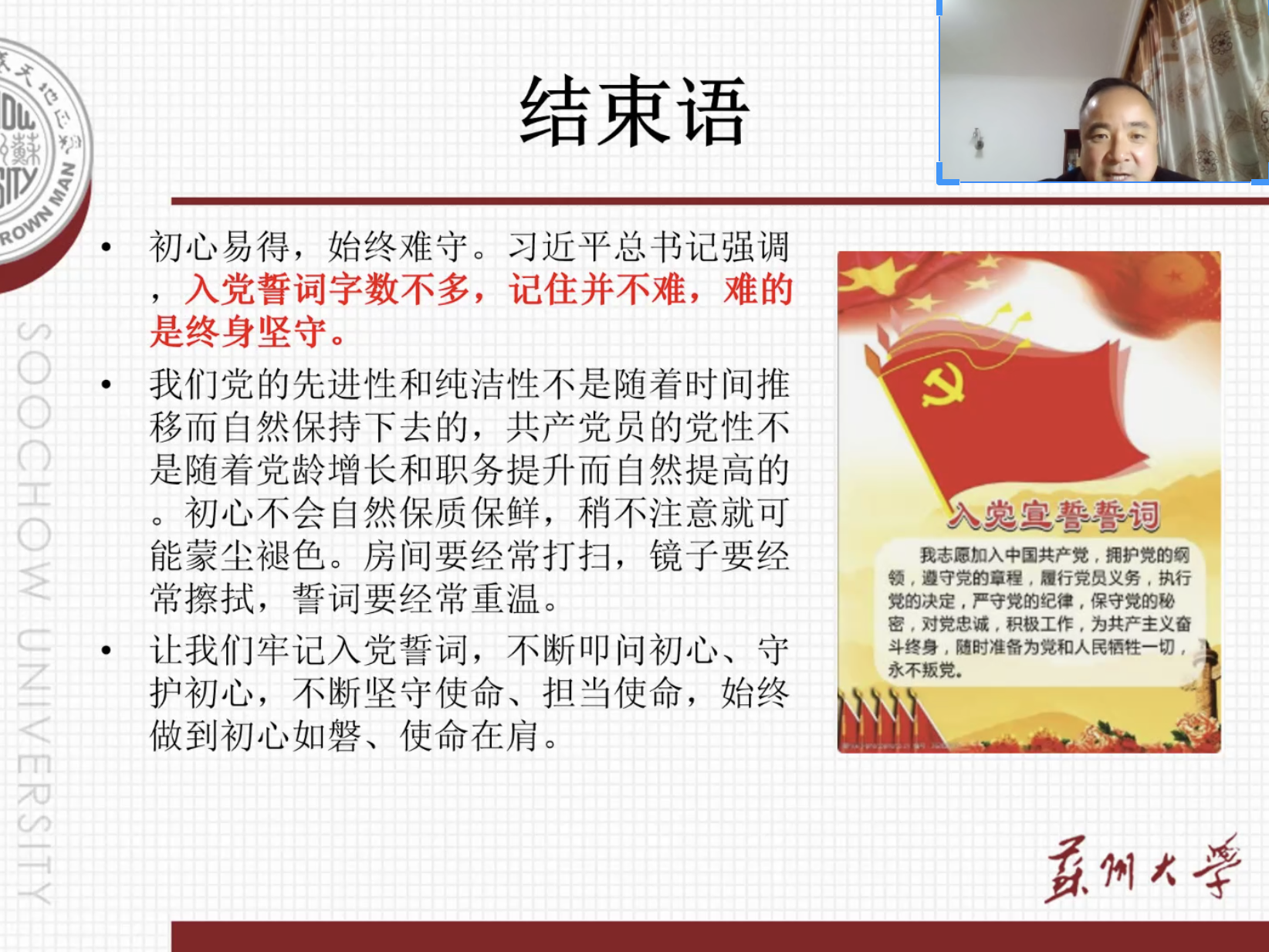 入党誓词是党员对党作出的庄严承诺,是每一名党员的责任与义务的体现。理解入党誓词,是每一个共产党员的必修课,也是读懂中国共产党的一把钥匙。重温入党誓词,回望初心,正是强化思想入党的重要方式。查部长进一步指出,入党誓词是中国共产党党员的宣誓书——用最为精炼质朴的语言诠释了党性,更明确了对党员的基本要求;入党誓词是党员对党组织的承诺书——坚守入党誓词是对党员永恒的要求;入党誓词是加强党性修养的座右铭——对入党誓词要始终践行,做到终身坚守并在群众中发挥先锋模范作用。
