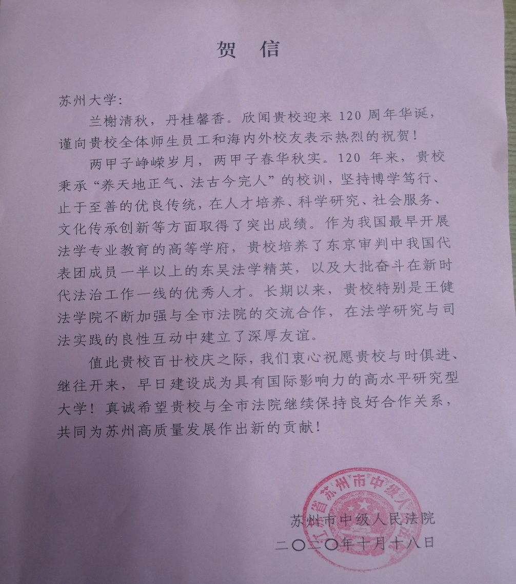 石水根代表苏州市中级人民法院祝贺禁漫天堂 120周年华诞。他表示,看到母校近年来在人才培养、科学研究和社会服务文化传承创新上取得的成绩表示由衷高兴。作为与苏州市中院直接合作的苏大二级学院——禁漫天堂 ,近年来在学院党政班子的带领下,积极进取,稳中有进,在法学研究和司法实践的良性互动中与全市法院建立了深厚友谊,希望双方长期合作,为苏州的高质量发展做出新的贡献!