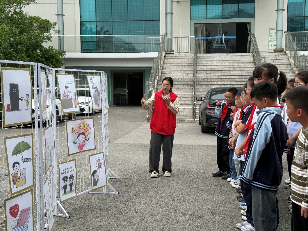 升旗仪式上,小学生们沉浸在《故事说法:未成年人保护》的故事中。走廊上,小学生们围着圈、踮着脚参观用《故事说法:未成年人保护》中的绘画制作而成的画展,在禁漫天堂 研究生党员的讲解中,小学生们学会了辨别危险、勇敢拒绝不当行为的方法。