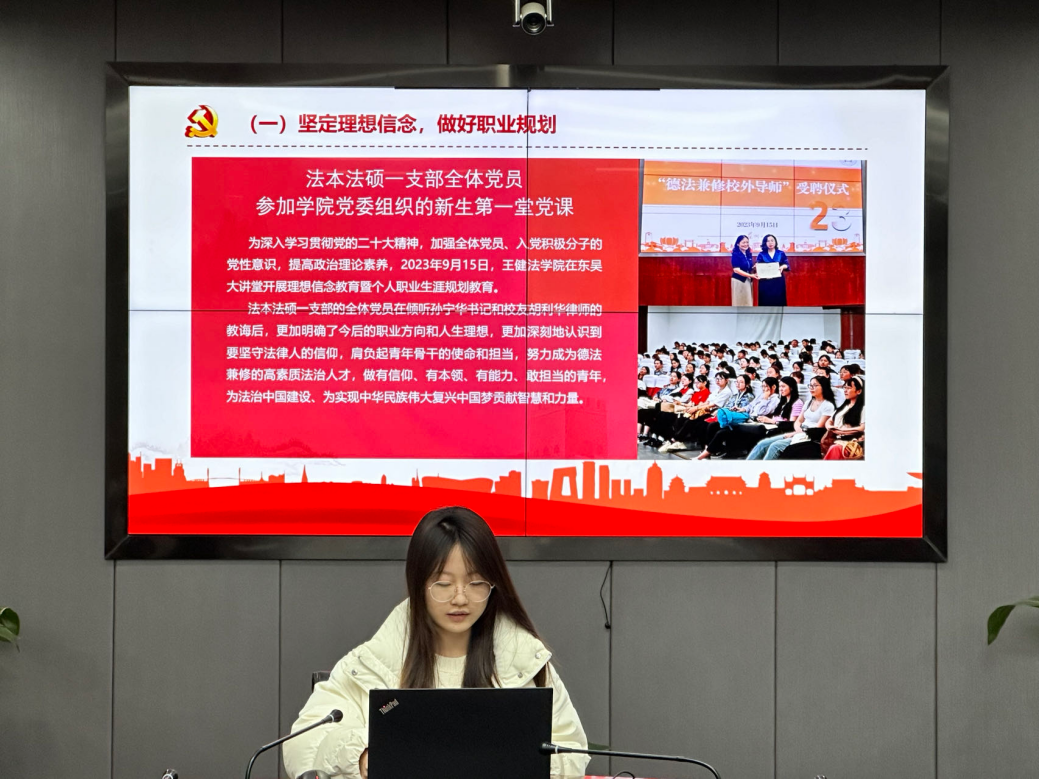 法律硕士(非法学)一支部书记陈云帆汇报了本年度的基本工作情况,年度工作包括:深化理论学习,不断夯实党员的思想基础;淬炼实践能力,积极奉献党员的红色力量;培养良好风气,树立廉洁奉公的党员形象;完善支部管理,发挥基层支部的灵活优势四方面。并总结了其工作的不足,如在新生党员档案转接出现失误以及活动形式较为单一,党员之间的沟通较少的问题,并在此基础上提出了未来工作思路的调整与总结。