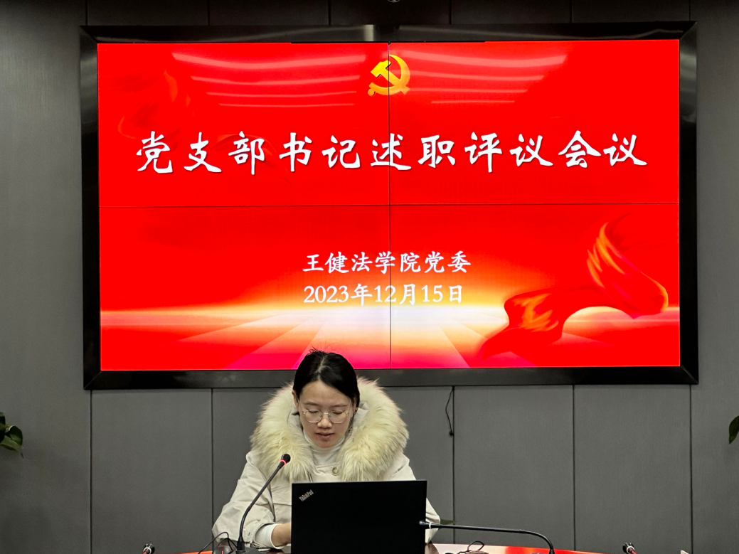 本科二支部书记刘桂宏汇报本年度的基本工作情况:支部以习近平新时代中国特色社会主义思想为行动指南,认真学习贯彻落实党的二十大精神,创新主题党日活动,不断激发党建活力。以培育新时代德法兼修高素质法治人才为方向,围绕立德树人根本任务,充分发挥“成长之友”头雁领航作用,进一步提升样板党支部建设,创建学习型、创新型、服务型党组织,并从“日常工作”、“工作创新”、“总结思考”三方面对支部的工作进行了总结。