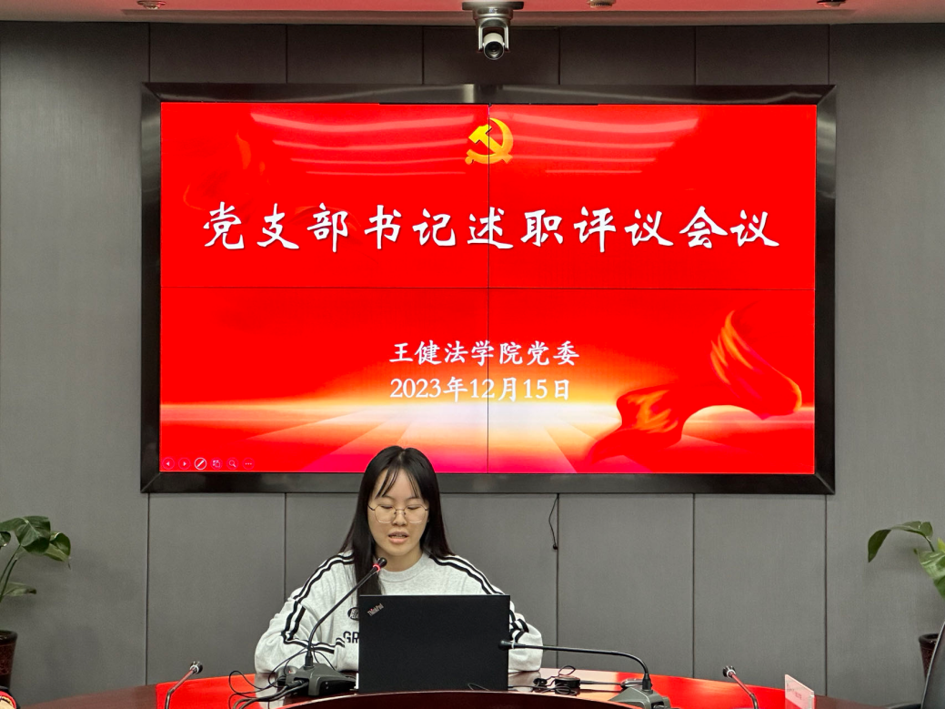 首先由本科一支部书记单杰进行述职汇报。单杰总结了本年度支部的主要目标和具体做法:“始终坚持以习近平法治思想为引领,紧密围绕习近平总书记提出的“立德树人,德法兼修,培养大批高素质法治人才”育人目标,着力打造“习法逐梦”党建品牌。”作为学校样板支部,单杰从“习法”、养正”、“培根”、“铸魂”四方面阐述了党支部党建工作体制机制,总结了本科一支部的特色做法,特别是在科研实践方面取得了党支部建设标志性成果,起到了带头表率作用。此外,总结支部的不足之处在于政治理论学习不够及个别党员同学纪律意识不强,并提出了今后的整改思路。