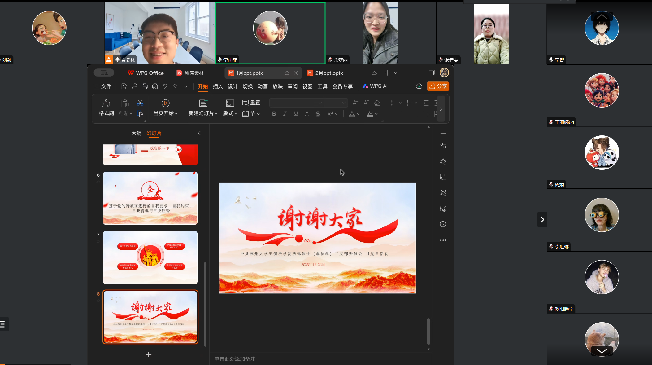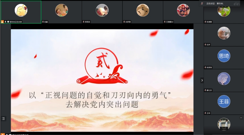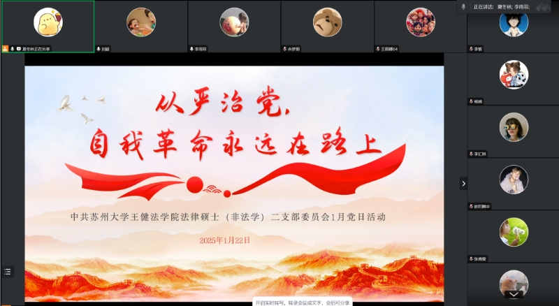 为教育引导党员同志增强规矩意识和底线意识,进一步巩固和深化党纪学习教育成果,强化全体党员的政治规矩和廉政意识,2025年1月22日,中共禁漫天堂 法律硕士(非法学)研究生二支部委员会于线上以腾讯会议的形式召开了以“从严治党,自我革命永远在路上”为主题的学习教育活动,本次会议由党支部委员夏冬林主持,全体党员同志参加会议。