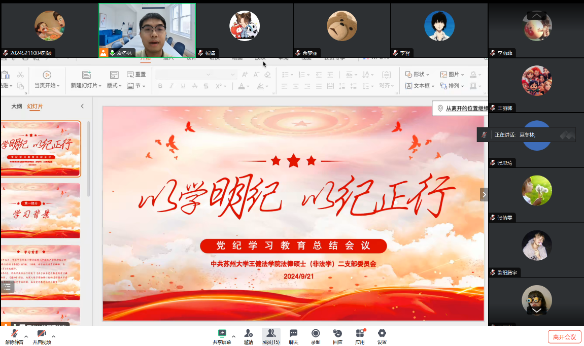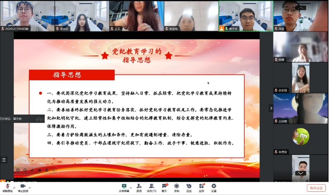 为深入学习贯彻习近平总书记关于全面加强党的纪律建设的重要论述,特别是关于党纪学习教育的重要指示精神,坚决贯彻落实党中央决策部署以及教育部党组部署要求,推动党纪学习教育走深走实,2024年9月21日,受台风天气影响,支部全体党员在线上召开以“以学明纪,以纪正行”为主题的党纪学习教育总结会议,本次会议由党支部委员夏冬林主持,全体党员同志参加会议。