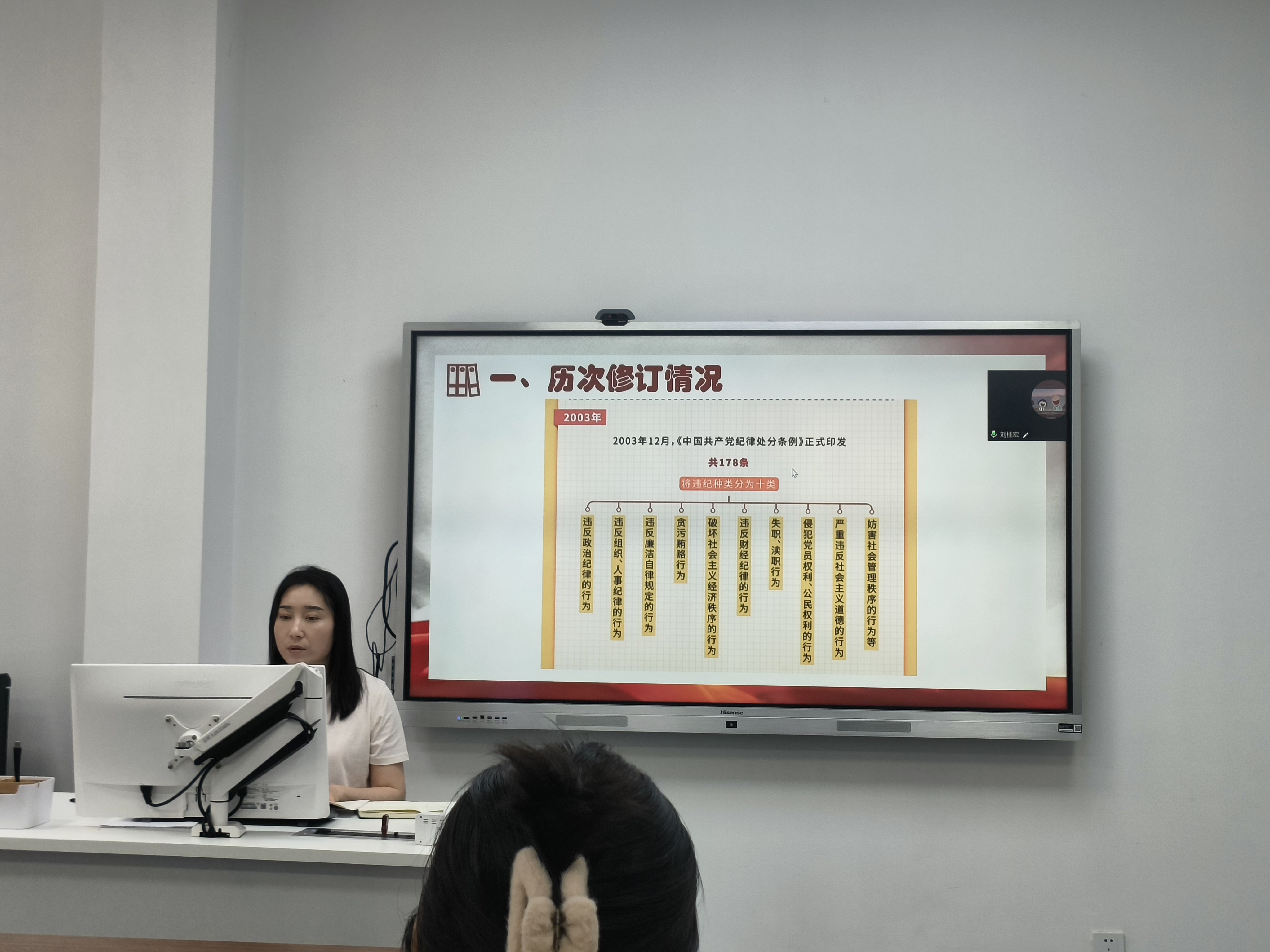 随后,刘桂宏老师带领支部同志共同学习《中国共产党纪律处分条例》,《中国共产党纪律处分条例》坚持依规治党与以德治党相结合,围绕党纪戒尺要求,开列制度负面清单,重在立规,是对党章规定的具体化,划出了党组织和党员不可触碰的底线。每位党员都应该依照《条例》,在自己心中拉起制度的“高压线”,规范自身言行,树立党员榜样。