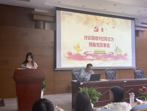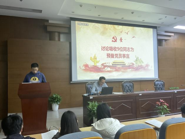 会议第一项议程,讨论吸收朱怀阳等9位同志成为中共预备党员。会上,各同志向大会汇报自身情况并宣读入党志愿书,入党介绍人逐一发表考察对象一年内的相关表现,支部书记单杰老师结合政治审查结果与党内外群众意见向支部大会作汇报。随后,与会党员发表意见,并对发展对象能否入党进行了充分讨论,采取无记名投票方式进行表决,会议一致同意接收朱怀阳、杨凯程、李圆圆、吕霖、李瑞莹、柯奚劼、蔡依辰、刘姝妤、吴英梅9名同志成为中共预备党员。