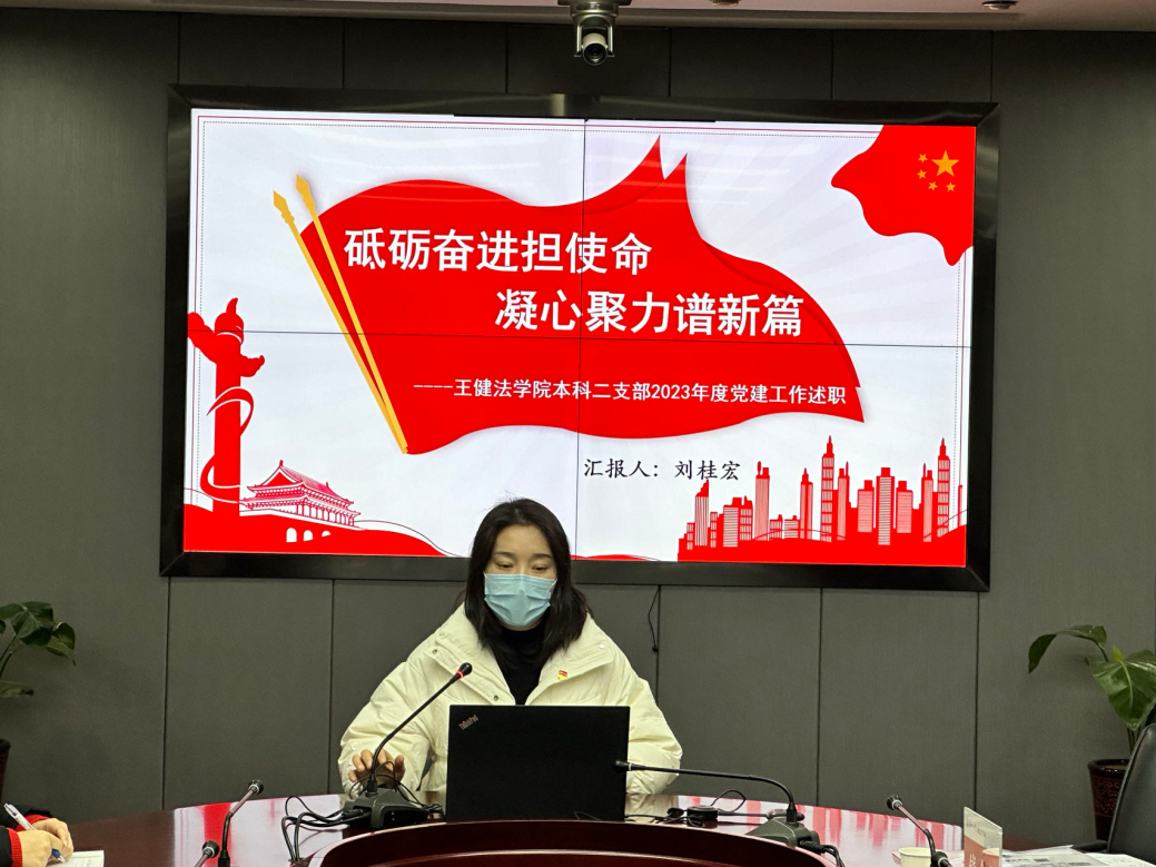 本科二支部书记刘桂宏汇报本年度的基本工作情况:支部以习近平新时代中国特色社会主义思想为行动指南,认真学习贯彻落实党的二十大精神,创新主题党日活动,不断激发党建活力。以培育新时代德法兼修高素质法治人才为方向,围绕立德树人根本任务,充分发挥“成长之友”头雁领航作用,进一步提升样板党支部建设,创建学习型、创新型、服务型党组织,并从“日常工作”、“工作创新”、“总结思考”三方面对支部的工作进行了总结。