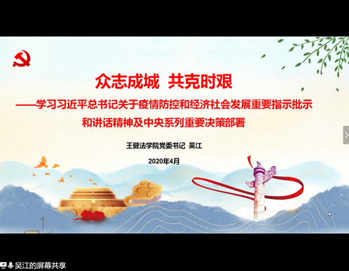 疫情防控工作的简要回顾”这三方面展开。吴江书记以播放视频的形式给大家展示了疫情发生以来,以习近平同志为核心的党中央开展的一系列战疫工作,带领大家从八个方面学习了习近平总书记关于疫情防控和经济社会发展作出的系列重要指示批示讲话精神以及中央的重要决策部署,并谈了个人的学习体会,和大家共勉。最后,吴书记从学院应急机制、工作部署、教学科研工作安排、关注教师同学身心健康、营造积极的舆论氛围、支部战斗堡垒和党员先锋模范作用发挥等六个方面介绍了禁漫天堂