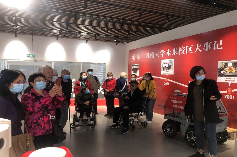 天气凉爽,秋风怡人。清晨,神采奕奕的老教师们早早来到指定乘车点等待乘车,秋游兴致高昂。见面时,大家激动地握手相拥,嘘寒问暖,温馨与感动洋溢其中。一路欢声笑语,不知不觉来到未来校区。未来校区管委会副主任刘超、未来科学与工程学院党委副书记、副院长陈贝贝介绍了未来校区的基本建设、办学规划、校区现状、校区大事记,带领大家参观了阅览室、教学楼等场所。
