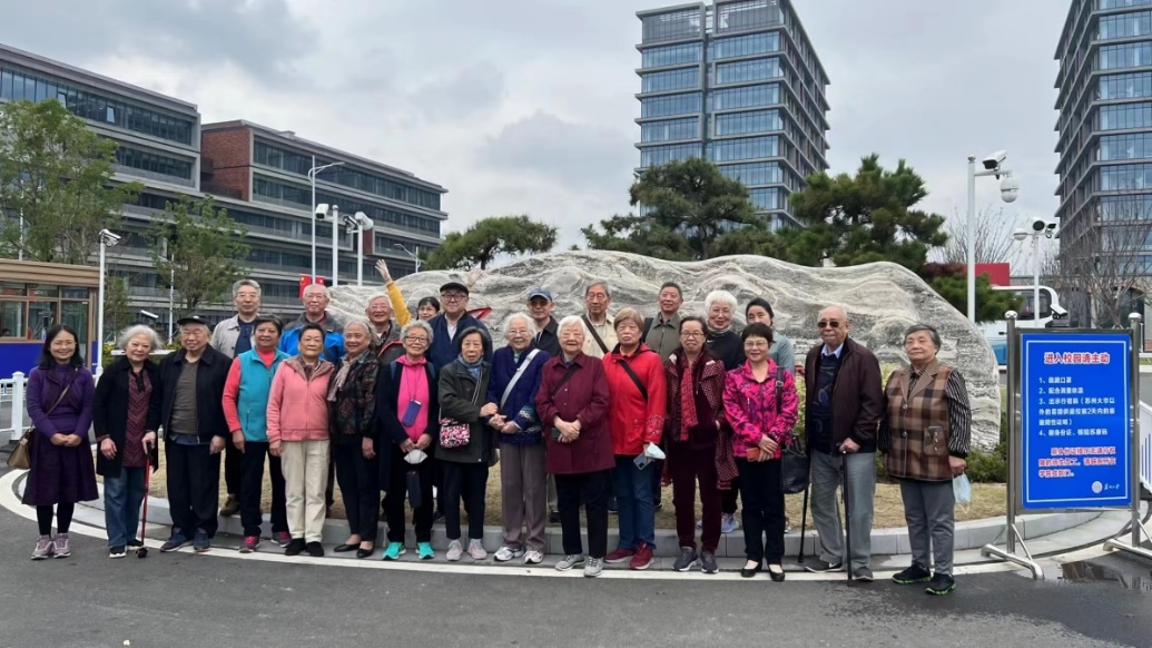 科技感十足的教学楼,宽阔的操场,现代化的教室,还有苏大的红砖墙和拱门,东吴大学的石牌门,吸引着老教师们驻足拍照留恋。老教师们感慨于科技的日新月异,赞美着新时代的幸福生活。