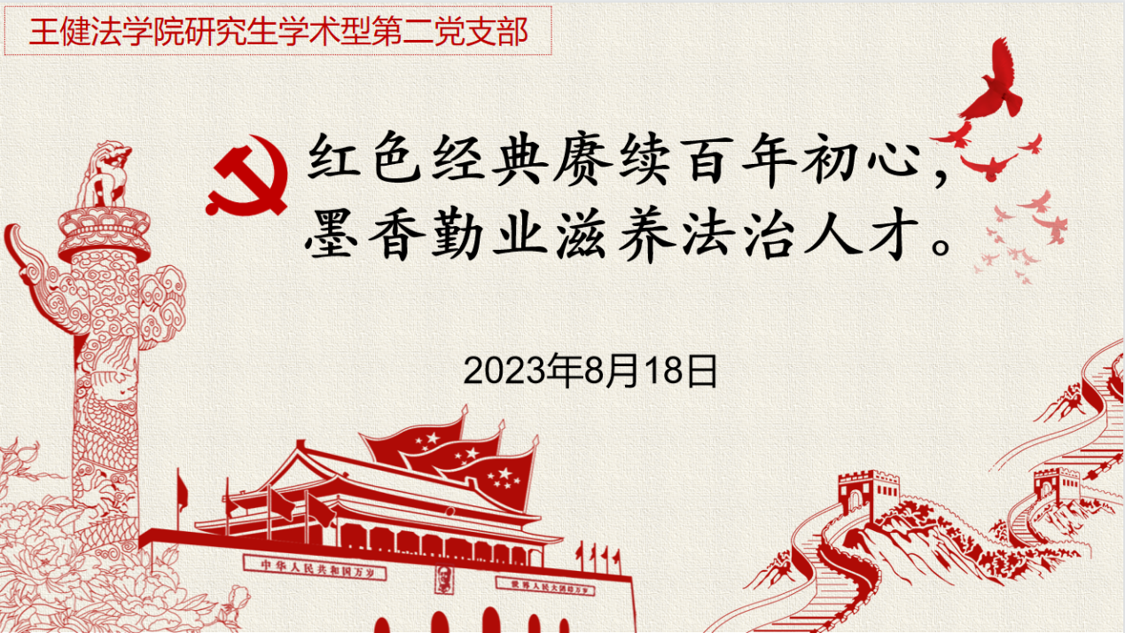 为深入学习红色经典,弘扬红色文化精神,提升法治思维,禁漫天堂 研究生学术第二党支部于2023年8月18日开展“红色经典赓续百年初心 墨香勤业滋养法治人才”理论学习活动,全体党员一起阅读经典读物,积极分享学习感悟,用自己的声音传递爱党、爱国的真挚感情,用自己的行动彰显法治人才的素养。