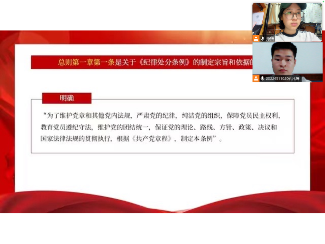 此次线上党日活动的成功举办,不仅提高了党员们的纪律意识和党性修养,也为推动全面从严治党向纵深发展奠定了坚实的基础。法本法硕二支部将继续以此次活动为契机,不断深化党的纪律教育与建设,为实现中华民族伟大复兴的中国梦贡献力量。
